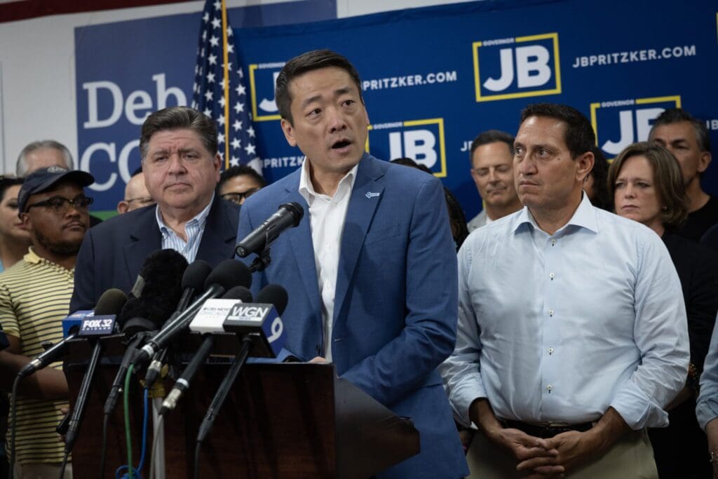 Illinois Governor JB Pritzker, left, and Texas Rep. Trey Martinez Fischer, right, listen as Texas House Democratic Caucus Chair Gene Wu speaks to reporters during a press conference at the DuPage County Democratic Party headquarters on Aug. 3, 2025 in Carol Stream, Illinois. Wu was with a group of Democratic Texas lawmakers who left the state so a quorum could not be reached during a special session called to redistrict the state. (Photo by Scott Olson/Getty Images)